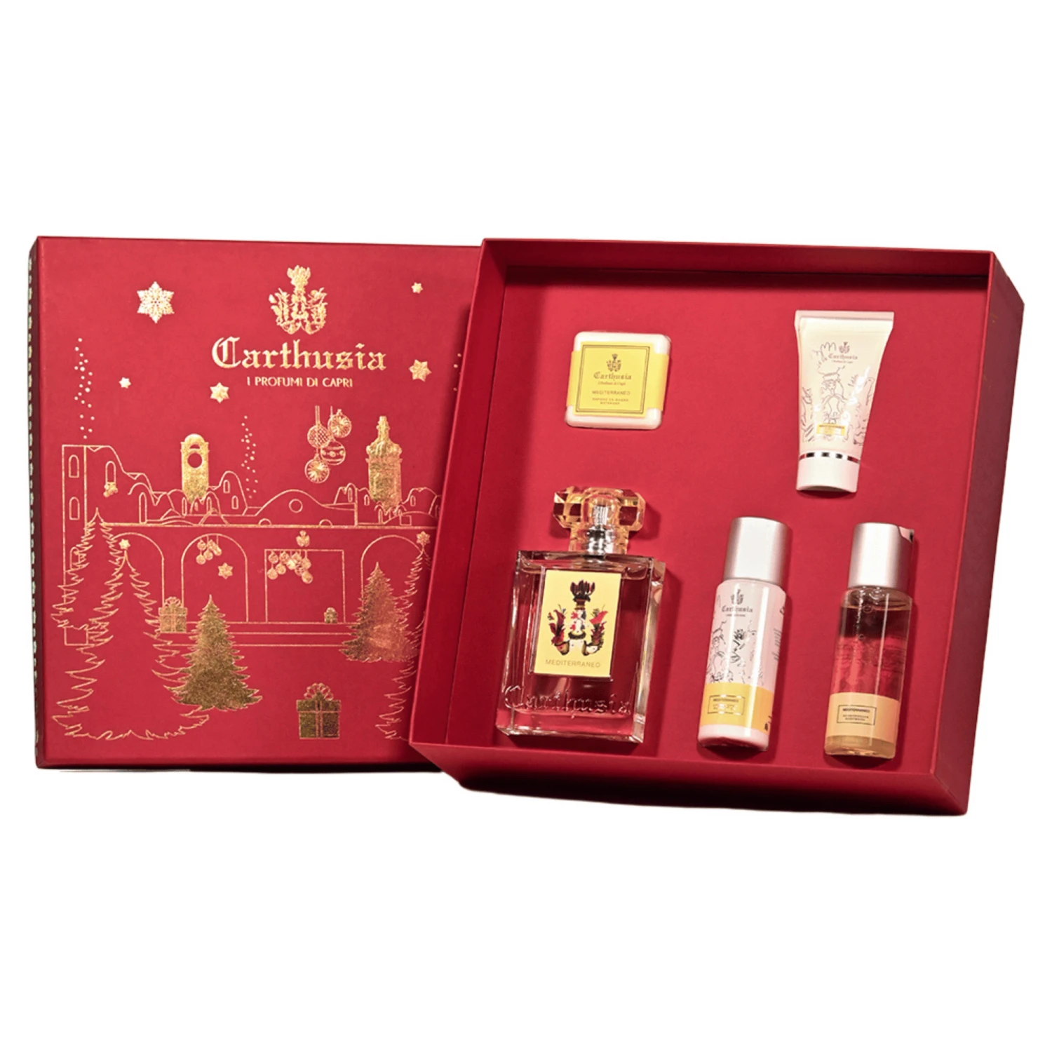 Exceptional perfume formulas dating back to a time when the monks living on Capri began to discover the exquisite aromatics of the herbs and blossoms on the island. This Special Edition La Certosa Gift Box contains five of Carthusia’s most coveted products in their sunny and dynamic Mediterraneo fragrance. Dedicated to the cradle of the great civilizations of Europe, Africa, and Asia, Mediterraneo is a sunny, ample, and original perfume that harmonizes the classic and clean freshness of lemon leaves with the young and sparkling notes of green tea.
