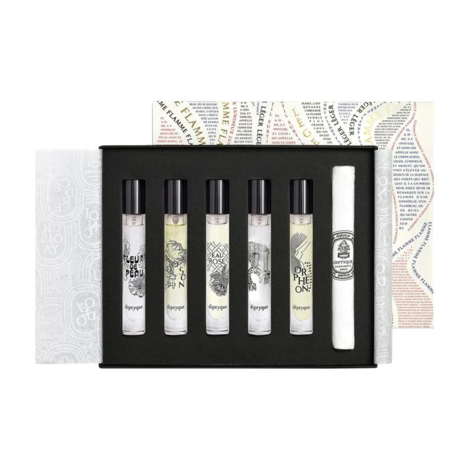 A gift set containing small bottles of Fleur de Peau, Eau Rose, Do Son, OrphĂ©on and Philosykos eau de parfum. Looking for a little inspiration? Here’s the perfect gift to leave beneath the tree. For the lucky recipient, it’s a chance to discover the Maison Diptyque and its emblematic eau de parfum. To celebrate the holiday season, Diptyque is showcasing the magic of the flame in a unique manner. In the form of a calligram inspired by the poetic definition found in the EncyclopĂ©die des Lumières, “flame” becomes the central motif of a special collection.