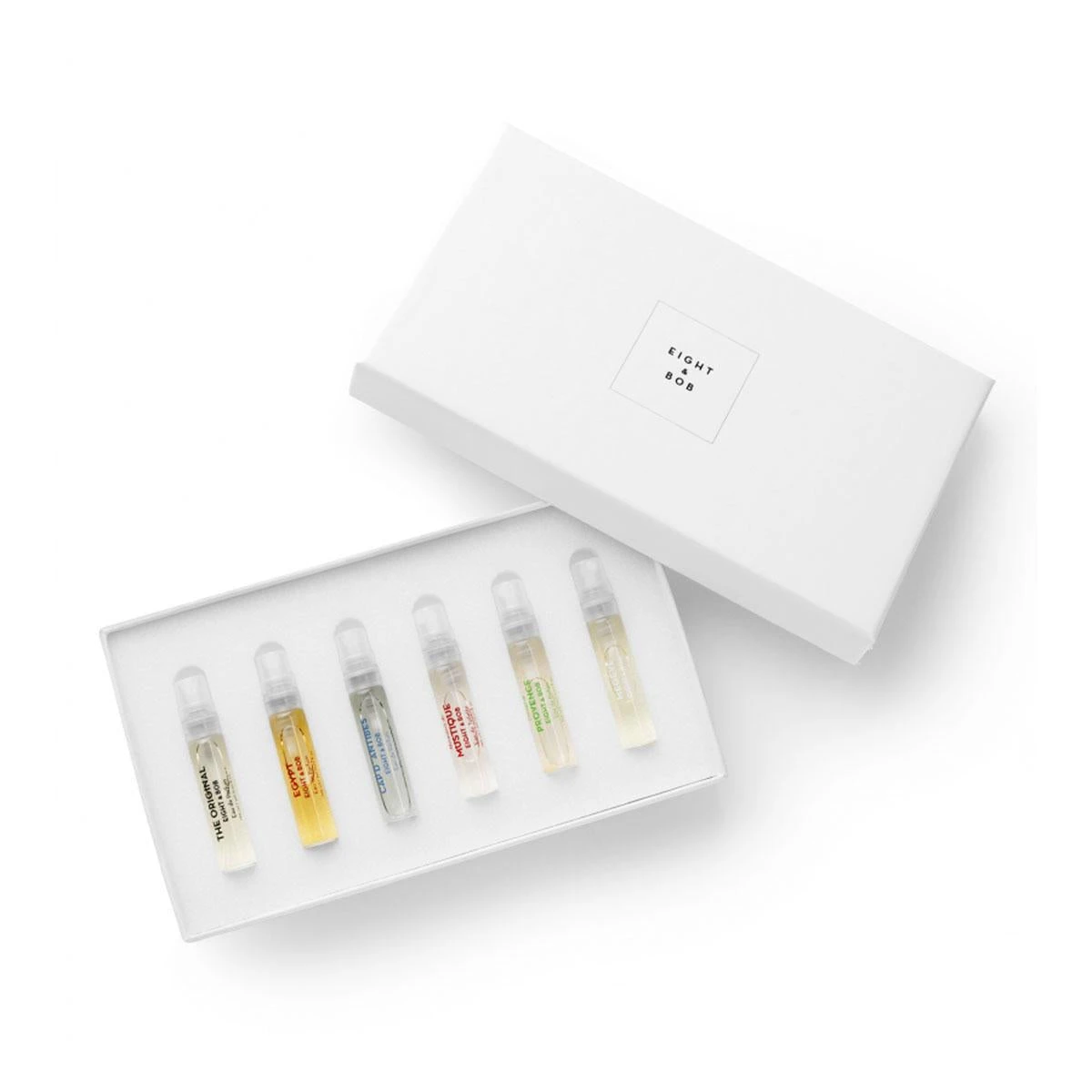 An elegant box which includes six of Eight & Bob’s most iconic scents: The Original, Egypt, Cap D’Antibes, M?mories de Mustique, Nuit de Meg?ve, Champs de Provence. Contains (6) 2ml vials.